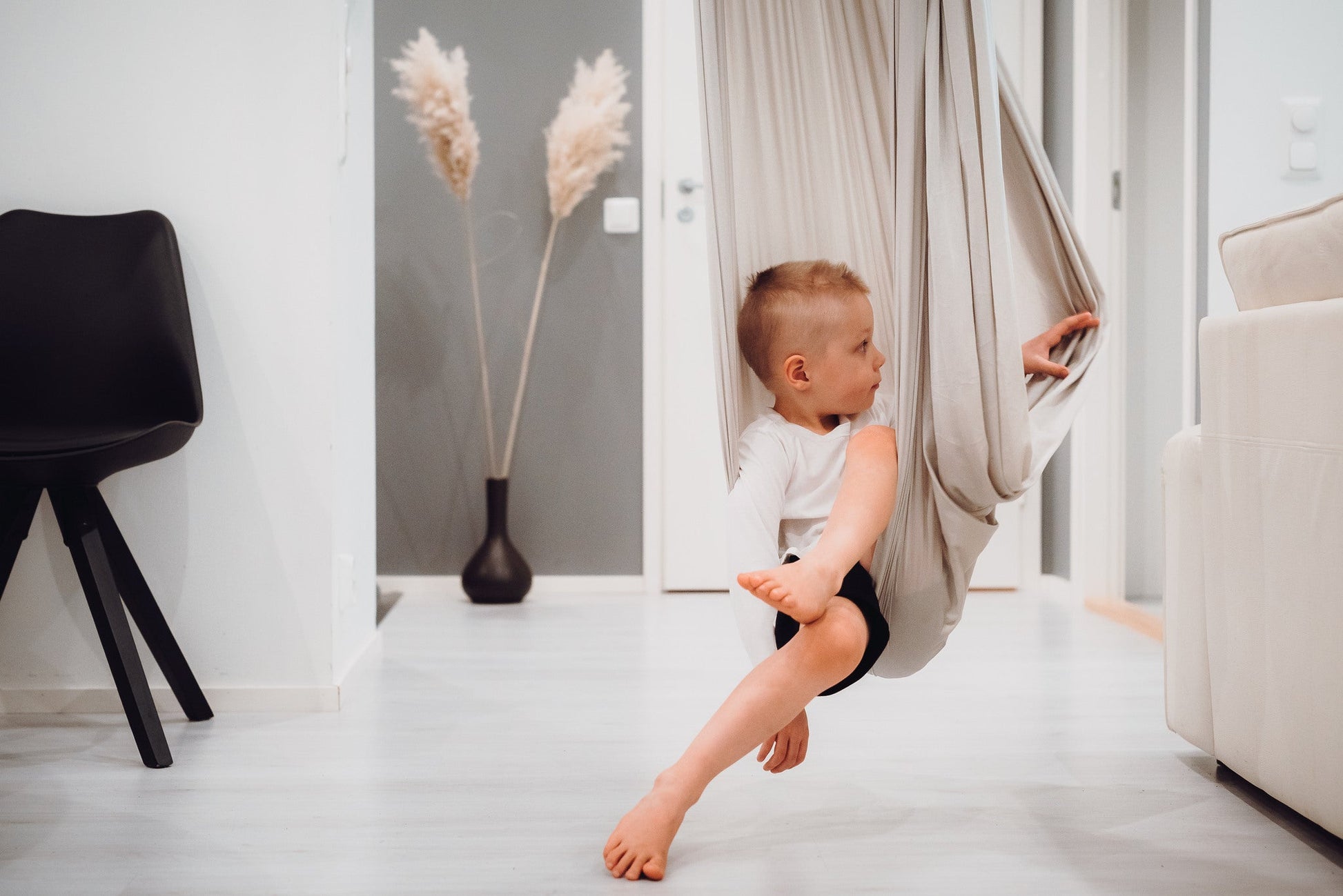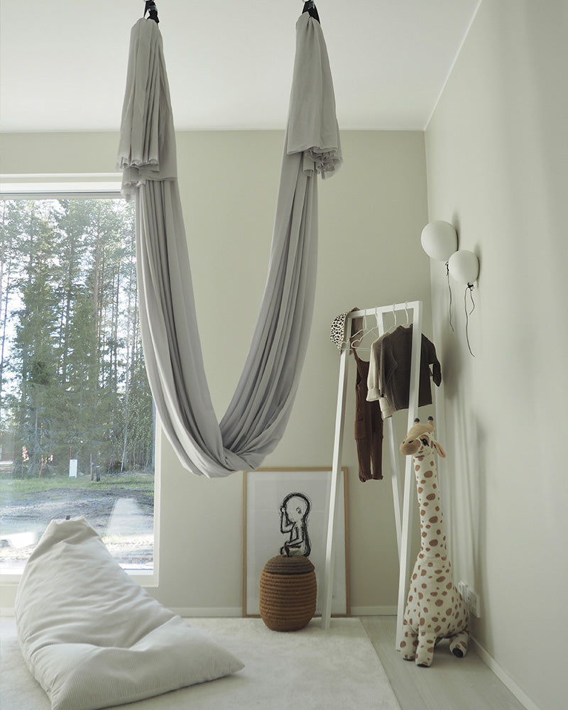 Aerial yoga-stoffet passer for både voksne og barn. Aerial yoga er en utmerket måte å styrke, strekke og slappe av kroppen. Barn liker også å leke på aerial yoga-stoffet. Det er behagelig å vikle seg inn i stoffet for avslapning.